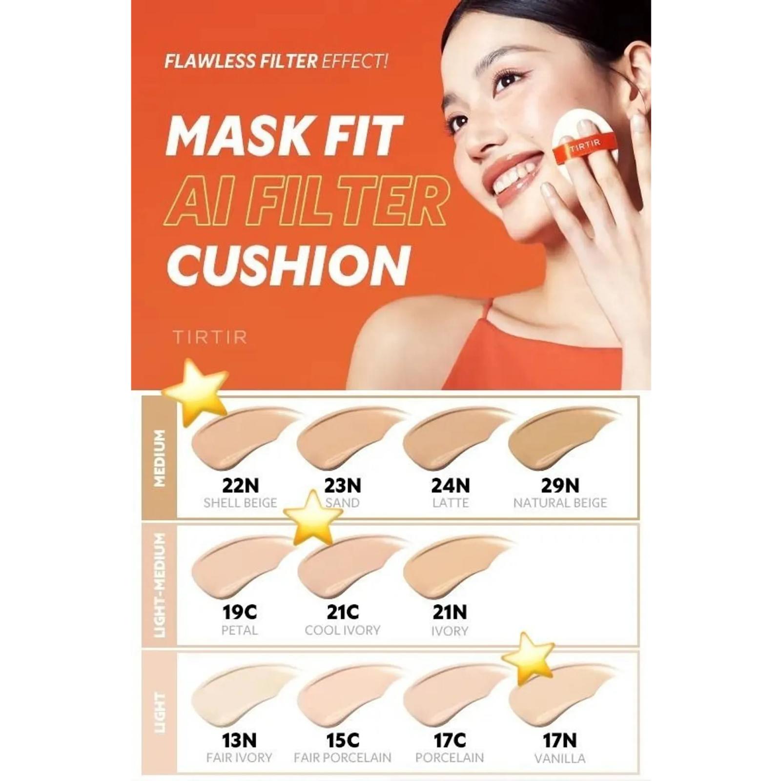 🌸日本版TIRTIR Mask Fit AI Filter Cushion Foundation 美肌濾鏡柔焦氣墊粉底連盒 SPF30 🔥🔥 TIRTIR事隔2年最新出嘅氣墊粉底🧡 主打高遮瑕✅,自然提亮✅同輕盈貼服✅ 3色選擇 A.17N Vanilla B. 21C Cool Ivory C. 22N Shell Beige 佢叫AI Filter Cushion係因為上妝後就好似AI幫你修圖咁,打造如AI美肌濾鏡般嘅柔焦半霧面妝感🙆🏻♀. 同品牌最熱銷嘅紅氣墊比,會有更高嘅遮瑕度添🙌🏻!上完佢真係可以唔洗再另外上遮瑕膏,泛紅、暗沉同毛孔等問題,輕輕上一層就可以瞬間被遮蓋曬👌🏻 佢仲有一個特別嘅地方,就係盒蓋後面有d「粒粒位」🙂↕,係用嚟壓完粉後上臉前,先係粒粒位壓一壓🤚🏻~可以令粉撲沾粉得更均勻,同時避免上臉後過份厚粉🙅🏻♀,都會減少形成結塊嘅問題。持妝度高達 72 小時😉。 🌏 全球膚色研究,訂製專屬你的完美色號! ✨ 為什麼選擇 AI濾鏡無瑕氣墊? 💎 完美融合膚色:15 種色號,無論你是哪種膚色,都能找到與你契合的完美選擇。 💧 柔焦濾鏡效果:隱藏毛孔與細紋,打造自然無瑕光澤肌膚。 ☀ 輕盈長效持妝:全天候舒適不脫妝,讓肌膚自由呼吸。 🎨 精細色調匹配:基於專業色彩分析,實現無縫融合的底妝效果! 🌟 讓你的肌膚開啟濾鏡模式,完美無瑕,適合每一種膚色! 今天就選擇 AI Filter ON,找到屬於你的膚色訂製氣墊! 📦10月中